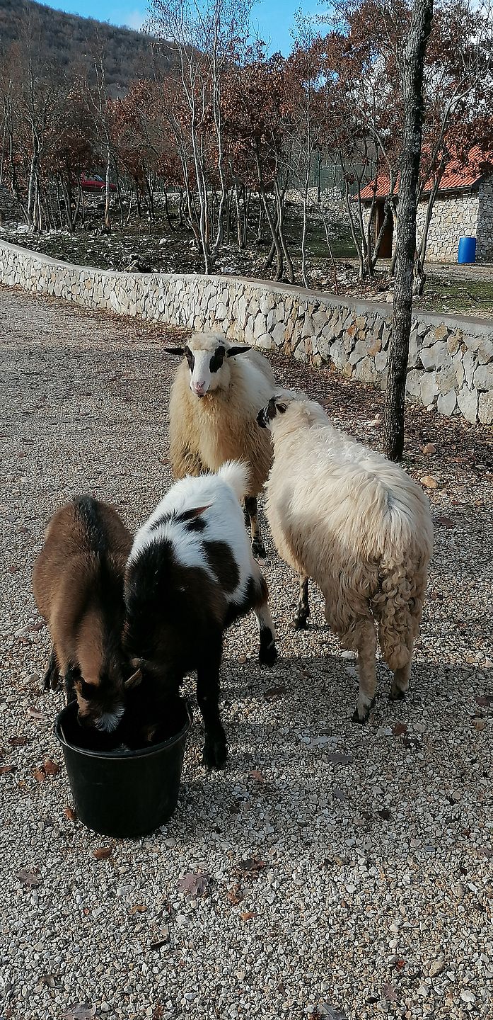 Od domaćih životinja trenutno imamo psa, konja, magarca, kravu, koze, ovce, zečeve, ptice i perad (fazane, koke, patke, guske, pauna, faraonke…)